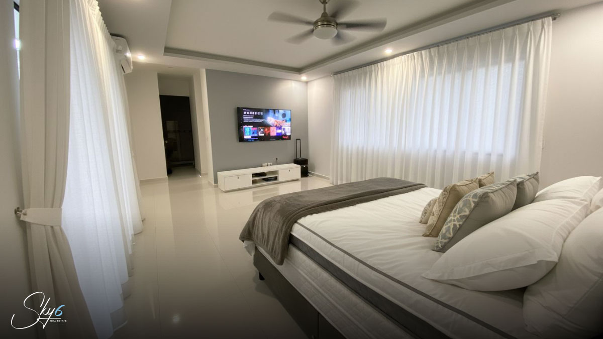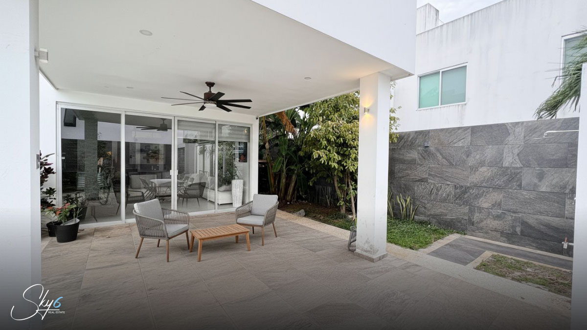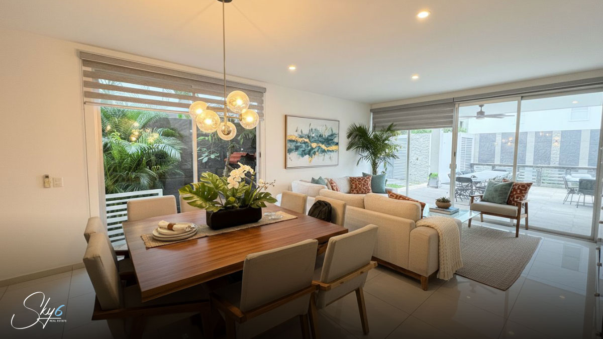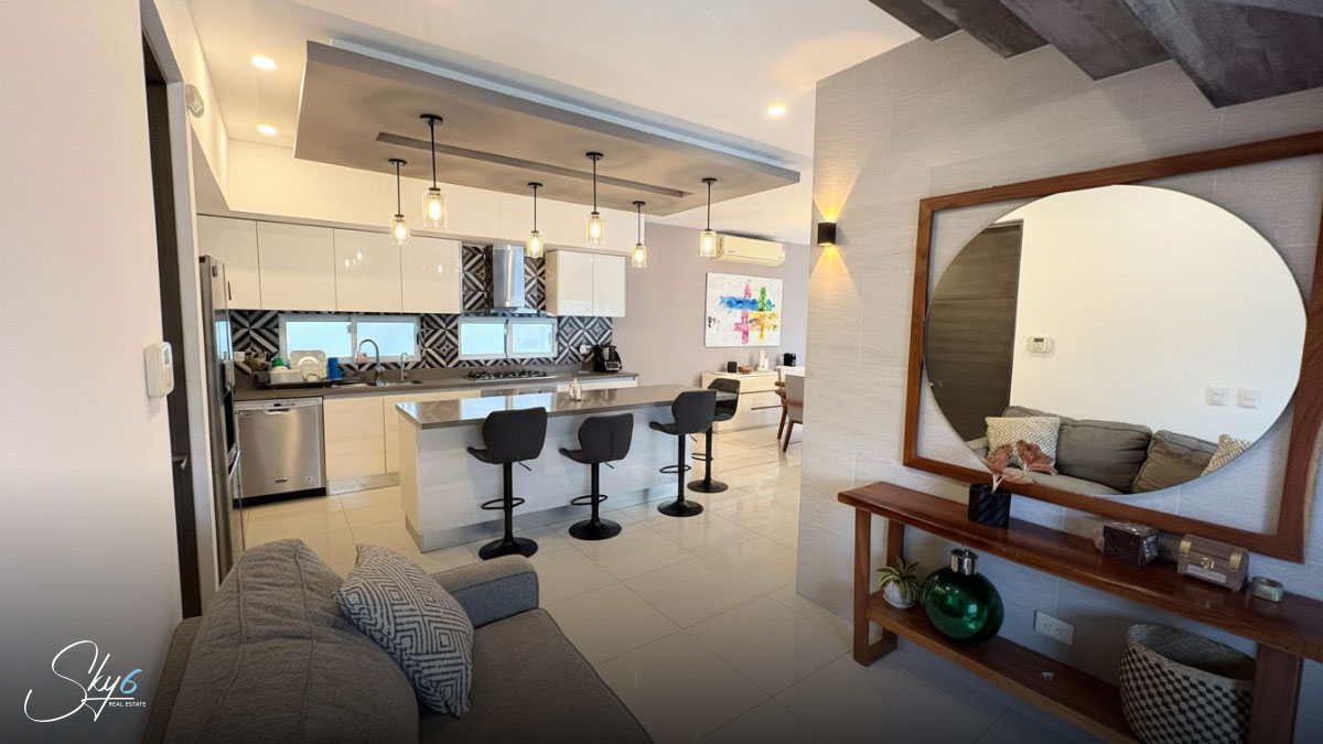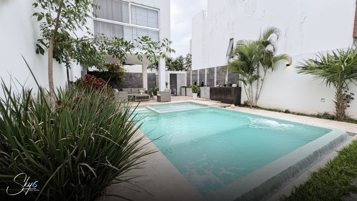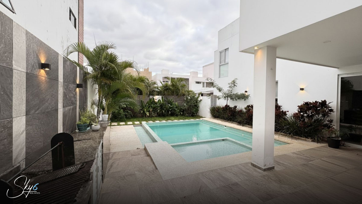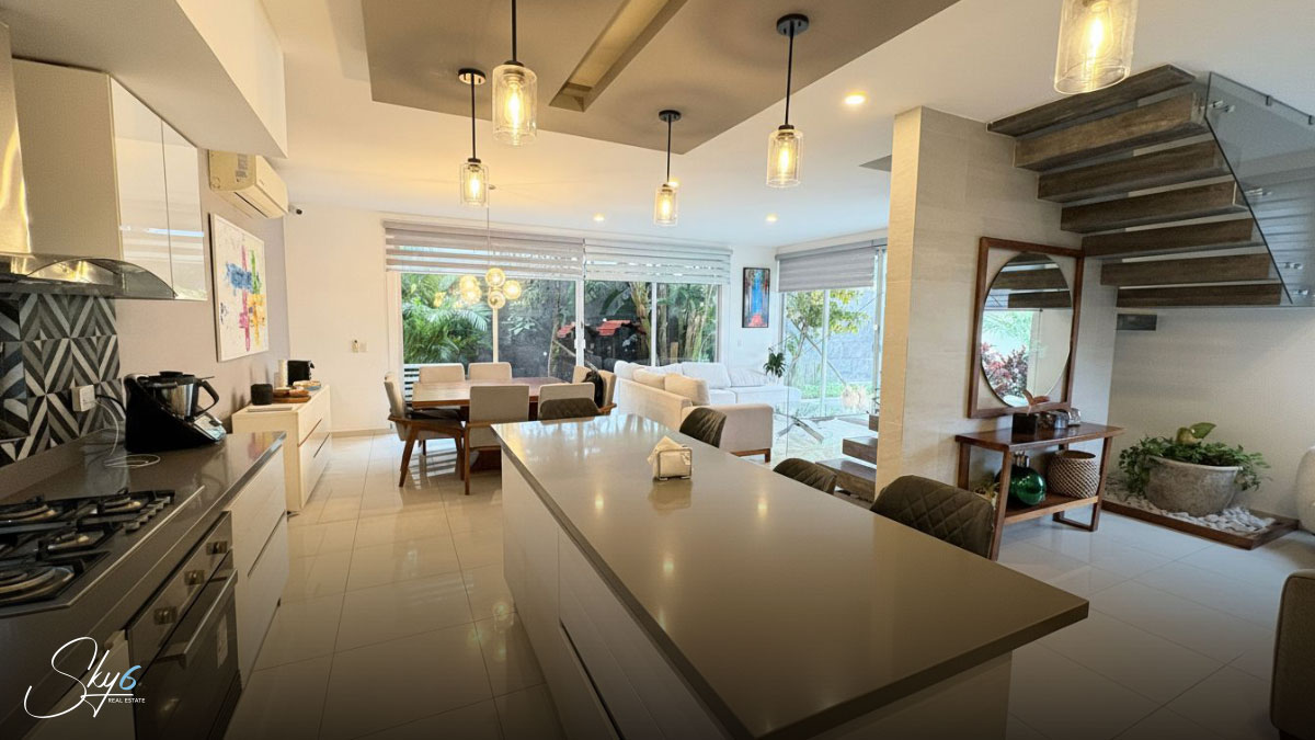 En primer lugar, hablemos de la distribución funcional en tres niveles. La planta baja te recibe con espacios abiertos que integran la estancia con una moderna cocina integral equipada, ideal para los amantes de la gastronomía. Además, la transición hacia el exterior es fluida, llevándote directamente a una espectacular alberca privada y un área de asador con barra de granito, perfecta para convivencias sociales inolvidables bajo el sol del Caribe.